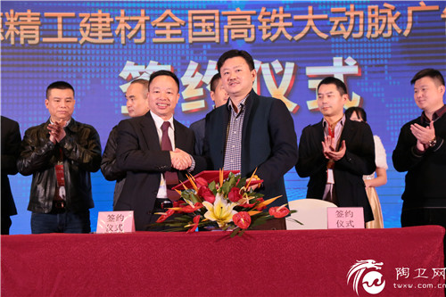 广东博德精工建材有限公司董事长叶荣恒与南京永达户外传媒有限公司董事长周志强签署广告投放协议。