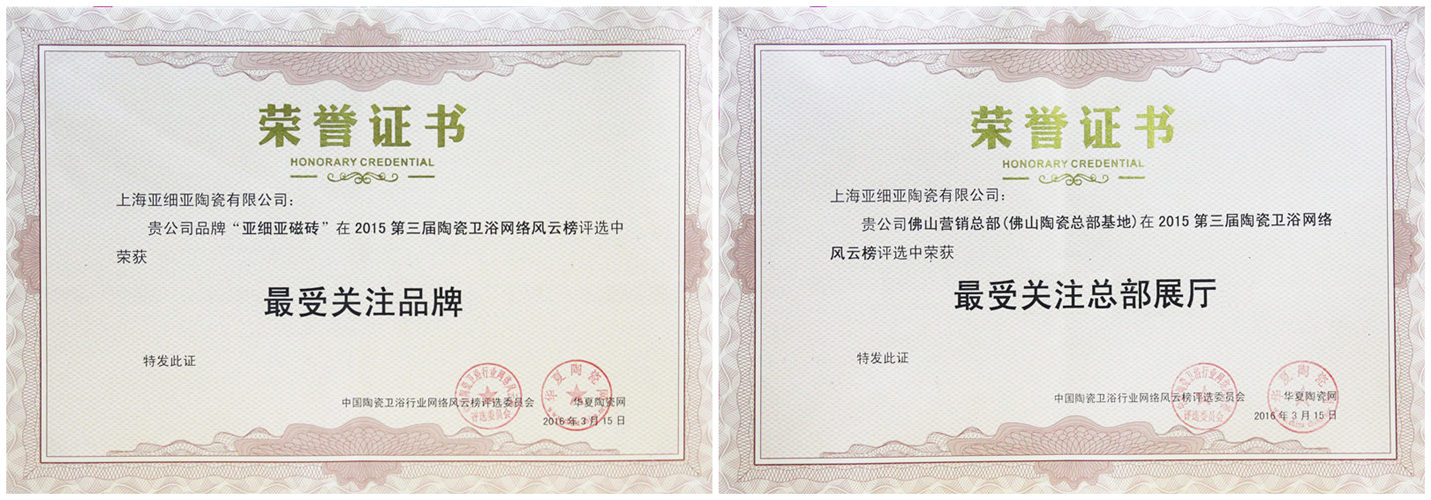 3月15日,2016第五届中国陶瓷50人论坛暨第三届网络风云榜颁奖礼在佛山银濠假日酒店举办,43年亚细亚磁砖凭借高端品牌形象、高品质产品和超高人气,冲破重重关隘,最终荣获“最受关注品牌”和“最受关注总部展厅”两项大奖。