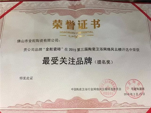 据悉,此次活动由华夏陶瓷网、中国建筑卫生陶瓷年鉴主办,论坛上将颁发陶瓷行业“最受关注品牌”、“最受关注人物”及“最受关注职业经理人”等多个奖项,所有评选采用严格的提名制,再结合微信投票和专家、媒体评审,是行业权威评选活动之一。在精彩的嘉宾发言之后,迎来了最受关注的颁奖环节。其中金舵瓷砖在2015第三届陶瓷卫浴网络风云榜评选中荣获“最受关注品牌提名奖”。