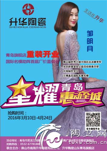 2016年4月24日,升华陶瓷青岛旗舰店重装开业,三大国际明星助阵首届厂价直供会。春回大地,万物繁盛,升华陶瓷也迎来了在青岛的首届厂价直销会。