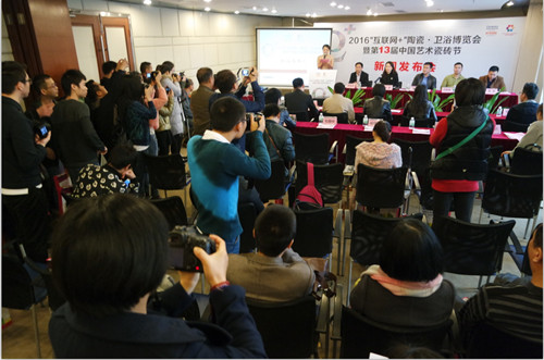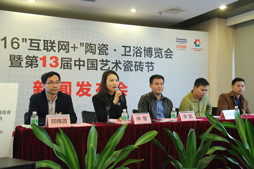 3月22日上午,2016“互联网+”陶瓷·卫浴博览会暨第13届中国艺术瓷砖节新闻发布会在瓷海国际商务中心举行,禅城区经济和科技促进局常务副局长李凯、副局长李玲玲、电子商务办公室常务副主任杨健华,佛山科学技术学院工业设计与陶瓷艺术学院陶瓷艺术设计系系主任吴斌,佛山电子商务协会秘书长刘明明,瓷海国际·佛山陶瓷交易中心董事副总经理林莹、董事助理黄琦玲,阿里巴巴佛山产业带优企公司总经理、万企电商学校校长郑伟源,佛山新媒体科技有限公司总经理张华,JNJ马赛克市场部任兴,以及近四十家媒体代表出席,共同见证第13届中国艺术瓷砖节的创新突破以及瓷海国际在“互联网+”方面的布局。