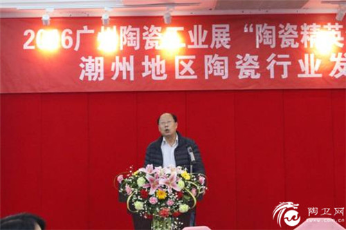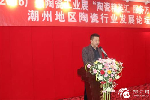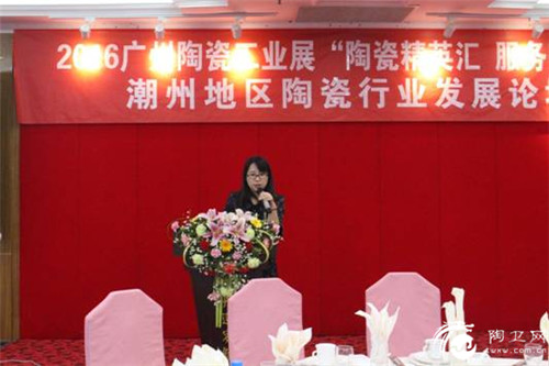 会议由中国贸促会建材分会陶瓷部负责人卢宏萍主持,中国贸促会建材分会周治洲副会长致辞,他表示作为2016广州陶瓷工业展的主办单位——中国建材贸促会成立于1992年,是中国贸促会和当年的国家建材局共同成立的事业单位。建材贸促会成立的宗旨就是按照当时对外改革开放的政策,为中外建材企业搭建一个“走出去,引进来”的贸易、技术服务机构。此次来到潮州,一方面是推荐陶瓷工业展扩大展会的知名度,更重要是贯彻贸促会全方位服务行业的理念,将服务延伸到展会之外,邀请行业知名的专家,和潮州的陶瓷协会和企业家一起,按照“中国制造2025”行动纲领,在新常态下,希望通过业内专家学者、企业、协会组织、政府之间的演讲、互动、学习,共同分享新思维及成功经验,促进行业创新水平,加快行业的转型升级,使我们陶瓷行业发展的更稳定,更健康。