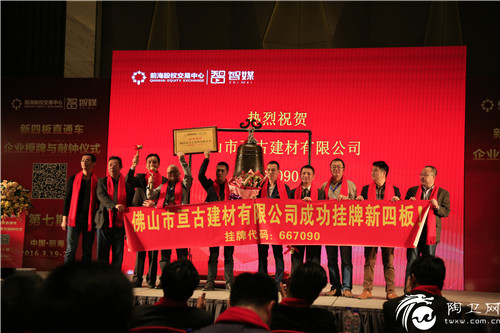 在新四板敲钟仪式中,亘古建材董事长何润炽如是说:“敲响佛山市亘古建材有限公司的交易钟,将我们企业带进资本市场,实现产业与金融双战略发展模式,让亘古建材有更广阔的发展空间。实现企业价值最大化,正式打通与资本市场接轨的通道!”