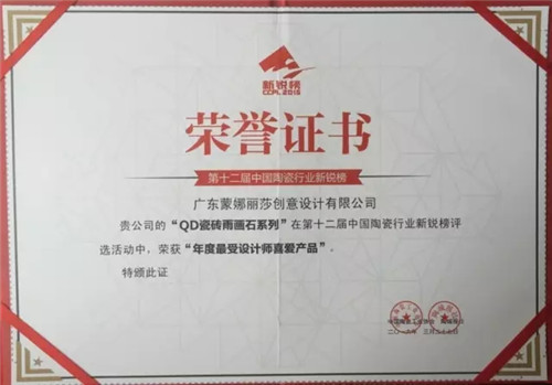 2016年3月27日,由中国陶瓷工业协会、陶城报社主办的第12届中国陶瓷行业新锐榜颁奖活动现场上,QD瓷砖荣获两项新锐大奖。有着中国陶瓷行业“奥斯卡”之称的新锐榜,自2004年推出以来,一直秉承着客观、公正、权威的评选准则,通过多重专家评审和公众投票方式,对数百个品牌进行严格评选。在本次新锐榜评选中,QD瓷砖能在众多一线品牌中突围而出,斩获两大奖项,足以见得QD品牌的创新能力非同一般,同时也是业内权威对QD瓷砖再美不过中国风品牌定位升级的高度肯定。