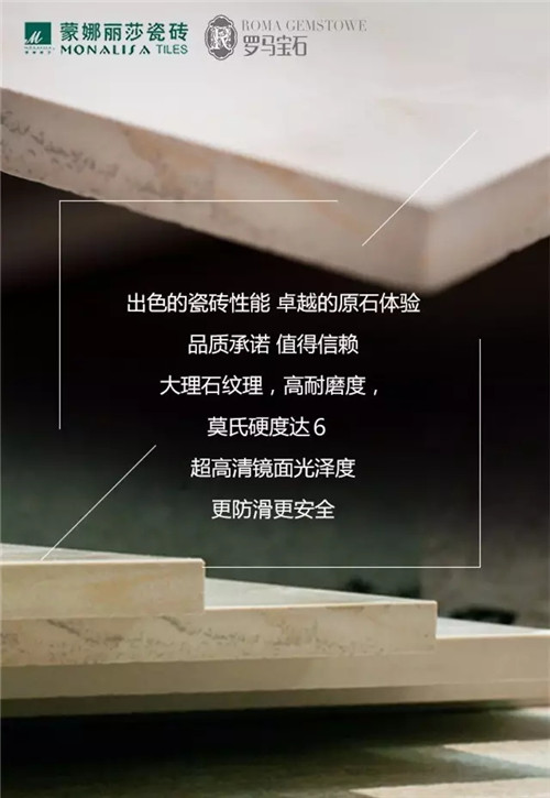 2016年,蒙娜丽莎集团再度升级“罗马宝石”,精选多款世界名贵大理石品种,通过采用意大利进口设备与最先进的耐磨高铝面浆原料,一比一还原顶级石材纹理质感,可替代传统抛光砖与全抛釉类产品广泛应用于各类高档、尊贵的家居或商业空间,充分满足高档消费群体、社会精英对真正高端绿色建陶的需求,塑造出卓越的空间享受与视觉体验。