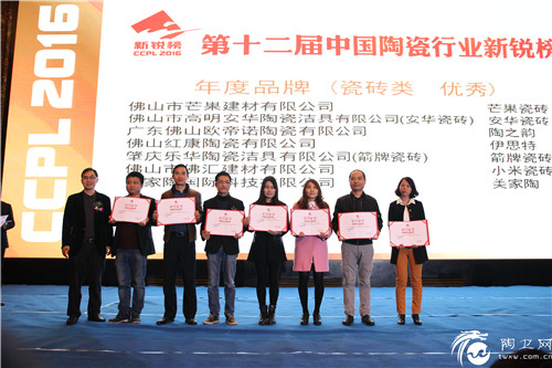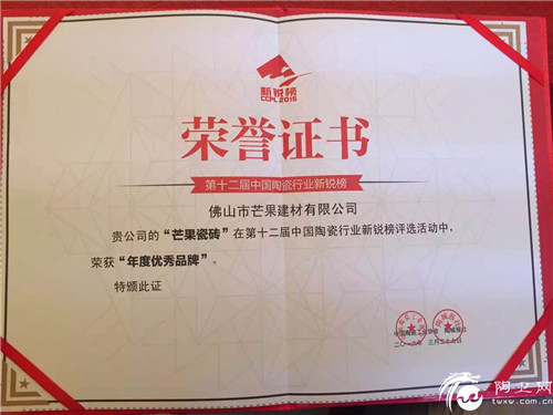 中国陶瓷行业新锐榜,由中国陶瓷工业协会和陶城报社于2004年联合推出,自推出以来,主办方注重创新活动的内容和形式,力求将每一届新锐榜办成新锐经典。历经为期两个多月的报名、复核、考察、评审等多个严谨的阶段,评选出16类奖项。在过去的一年,行业整体寒冬化、品牌竞争白热化,但是芒果瓷砖仍能凭借技术在产品上创新研发、渠道上深造成就,获得行业权威及媒体的肯定,这一奖项无疑是强而有力的证明。