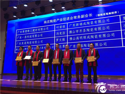 促进会常务副会长上台领取牌匾:叶荣恒(右一)当选南庄陶瓷产业促进会常务副会长