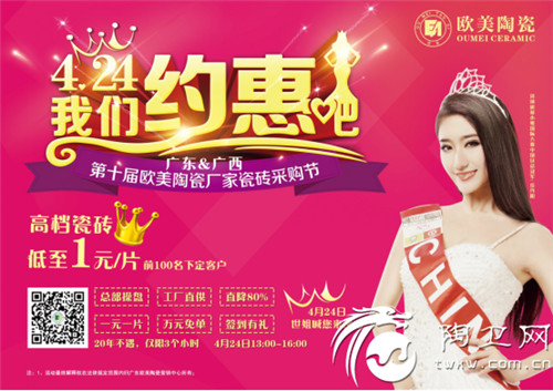 为感谢消费者对欧美陶瓷一直以来的支持与厚爱,欧美陶瓷佛山总部为广大消费者打造第十届欧美陶瓷厂家瓷砖采购节(广东&广西)的促销活动!不仅带给您无与伦比的高性价比产品,更让每一位消费者轻松享受五星级服务,让您满足在产品极致追求上享受到一步到位服务,让利幅度之大,奖品之丰厚,绝对给力!让您绝对称心如意!多种瓷砖产品一站式购物,满足您的装修需求。机会难得,不容错过!