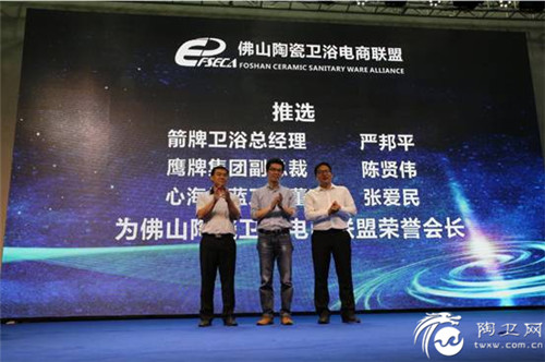 箭牌卫浴总经理严邦平、鹰牌集团副总裁、佛山泛家居电商创意园总经理陈贤伟、心海伽蓝卫浴董事长张爱民,聘请为佛山陶瓷卫浴电商联盟荣誉会长!