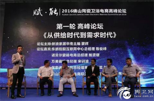 轮到本次活动的核心环节——高峰论坛,本次论坛以《从供给时代到需求时代》为讨论主题,邀请了东鹏控股互联网中心总经理陈俊峰、诺贝尔瓷砖电商总经理鲍贤增、万美瓷砖总经理宋训波、佛山陶瓷卫浴电商联盟执行会长兼秘书长朱秀武、居家通副总经理兼营销总监刘阳林等行业大咖作为论坛嘉宾,由新浪家居华南主编蒙辉担任论坛主持。论坛环节中,几位嘉宾唇枪舌战,就陶瓷卫浴行业对于消费者的供需转化展开了深入讨论。