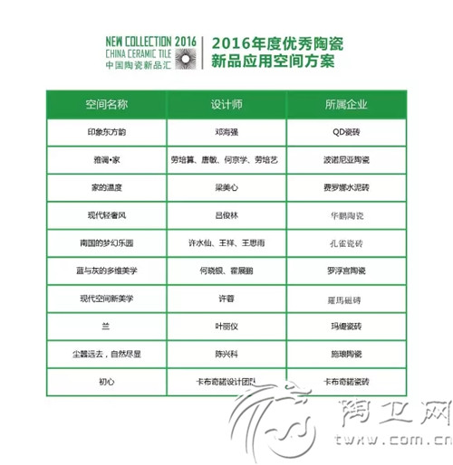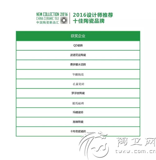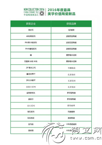 当天活动揭晓了2016中国陶瓷新品汇三大美学风尚大奖,QD瓷砖、波诺尼亚陶瓷等10家陶瓷企业17款产品入选2016年度最具美学价值陶瓷新品,罗浮宫陶瓷、罗马磁砖等10家陶瓷企业当选为2016年度优秀陶瓷新品应用空间方案,卡布奇诺瓷砖、费罗娜水泥砖等10家陶瓷企业被评为2016设计师推荐十佳陶瓷品牌。