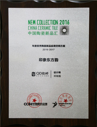 “再美不过中国风”的定位,为QD瓷砖提供了个性和爆发点。无论是产品还是空间应用上都为陶瓷装饰行业带来一种新的风格。由集团总部品牌设计师应用浣纱石设计的印象东方韵,从传统建筑中提炼色彩、艺术、布局、材质为元素,通过东方禅意美学的组合方式营造出中式风格的独特之美,受到新品汇评审团队的认可和赞美,获得年度优秀陶瓷新品应用空间方案。