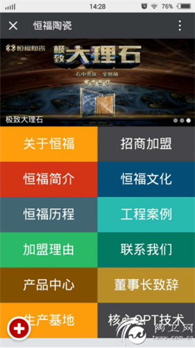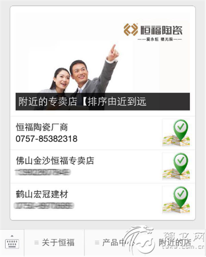 恒福微网站的上线,不仅对本品牌打造的意义重大,消费者只要关注恒福的微信号,就能浏览恒福的微网站,同时也是恒福在移动营销方面的创新。恒福微网站的优势:1、随时随地向消费者展示恒福陶瓷的影响力;2、附近的店功能,消费者可通过“附近的店”上的导航功能,快速找到当地的恒福专卖店;3、随时随地查看恒福各方面的详细信息,方便快捷;4、贴心的导购功能,具有恒福全系列的产品及产品应用案例,方便选择。