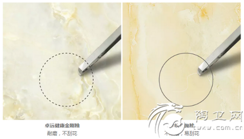金刚釉的走红,很大程度上源于其优于传统全抛釉的产品性能,其中,较为明显的是它克服了传统全抛釉不耐磨、易刮花等困扰行业和消费者的性能缺陷。卓远陶瓷采用最新研发的金刚颗粒混合技术,使砖面釉层形成金刚石般坚硬的分子结构,产品莫氏硬度高达5-6级,比传统全抛釉提升39%,是目前行业釉面砖莫氏硬度的极限。它弥补了传统全抛釉的应用缺陷,也将逐渐改善全抛釉无法广泛应用于公共场所的现状,拓宽全抛釉的使用领域。