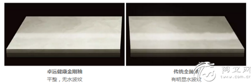 众所周知,全抛釉以其自然的纹理、天然石的材质感深受消费者的喜爱,但在灯光下,釉面呈现的水波纹却容易让人出现视觉晕眩等不良反应,这一缺陷一直困扰行业,也限制了全抛釉的受众度。为从根本上解决这个问题,卓远在健康金刚釉的生产过程中,不惜重本投入,施釉量高达1300g,是传统全抛釉的3倍;釉层厚度达0.65mm,比传统全抛釉提升225%。金刚釉砖面平整度更高,砖体更通透,纹理更流畅,装饰效果更好。