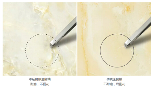 金刚釉的走红,很大程度上源于其优于传统全抛釉的产品性能,其中,较为明显的是它克服了传统全抛釉不耐磨、易刮花等困扰行业和消费者的性能缺陷。卓远陶瓷采用最新研发的金刚颗粒混合技术,使砖面釉层形成金刚石般坚硬的分子结构,产品莫氏硬度高达5-6级,比传统全抛釉提升39%,是目前行业釉面砖莫氏硬度的极限。它弥补了传统全抛釉的应用缺陷,也将逐渐改善全抛釉无法广泛应用于公共场所的现状,拓宽全抛釉的使用领域。