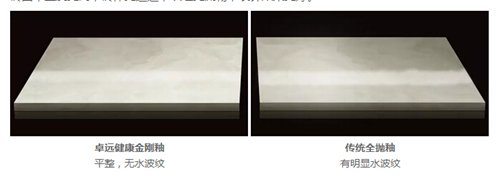 众所周知,全抛釉以其自然的纹理、天然石的材质感深受消费者的喜爱,但在灯光下,釉面呈现的水波纹却容易让人出现视觉晕眩等不良反应,这一缺陷一直困扰行业,也限制了全抛釉的受众度。为从根本上解决这个问题,卓远在健康金刚釉的生产过程中,不惜重本投入,施釉量高达1300g,是传统全抛釉的3倍;釉层厚度达0.65mm,比传统全抛釉提升225%。金刚釉砖面平整度更高,砖体更通透,纹理更流畅,装饰效果更好。
