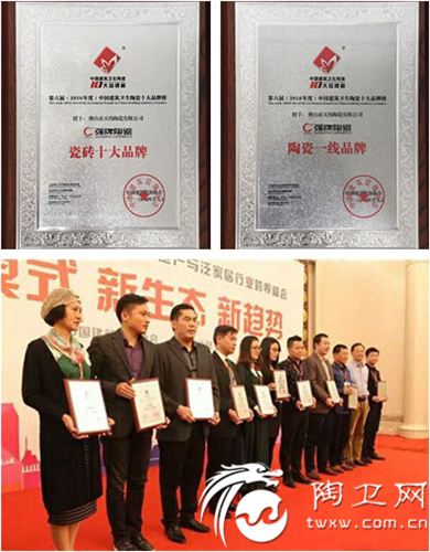 2016年4月9日,由中国陶瓷网、中国建筑装饰协会共同主办“第六届中国房地产与泛家居行业跨界峰会暨2016年度中国建筑卫生陶瓷十大品牌榜颁奖典礼”在北京人民大会堂隆重举行,强牌陶瓷荣获“瓷砖十大品牌”、“陶瓷一线品牌”双项殊荣。