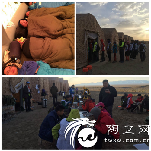 告别第一天的体验赛,早起,每个人都是蓬头垢面,衣服、鞋子里面全是沙子,煦日早已普照着辽远的戈壁,有一丝微凉的风,告别了昨晚第一夜狂风大作,帐篷里大伙收拾着睡袋,准备出发!