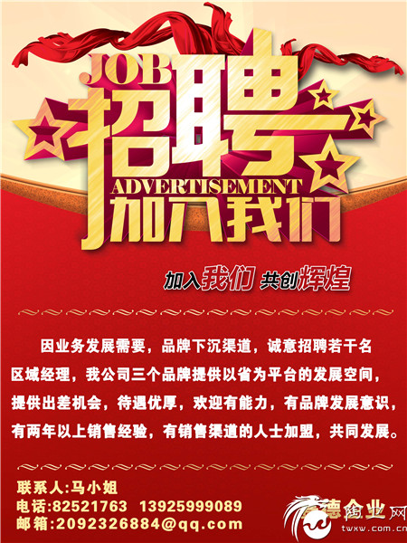 因业务发展需要,品牌下沉渠道,诚意招聘若干名区域经理,我公司三个品牌提供以省为平台的发展空间,提供出差机会,待遇优厚,欢迎有能力,有品牌发展意识,有两年以上销售经验,有销售渠道的人士加盟,共同发展。