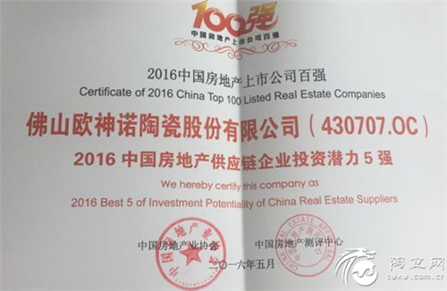 5月26日,在香港观景台举行的2016年中国房地产上市公司测评成果发布会上,佛山欧神诺陶瓷股份有限公司(企业简称:欧神诺,证劵代码:430707.OC)荣获了“2016中国房地产供应链企业投资潜力5强”称号,并受到了包括摩根士丹利、摩根大通、瑞信、渣打银行、瑞士银行、中银国际等各大投资机构的关注。