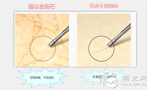 超晶金刚石表面的釉料采用的是进口并经企业自主研发提升而得到的专用的水晶耐磨釉,通过运用金刚颗粒混合技术使砖面釉层形成金刚石般坚硬的分子结构,砖面莫氏硬度达6度以上,硬度前所未有,坚硬耐磨,完美解决普通抛釉砖不耐磨,易划花的致命缺陷。