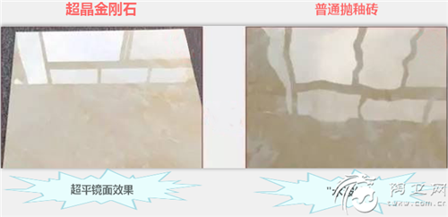 超晶金刚石釉层厚度是普通抛釉砖的3~4倍,釉层厚,可使用硬抛模块,将釉面平整度提高,直至达到影像镜面效果,从根本上解决了普通抛釉砖“水波纹”问题,用手触摸,表面光亮柔和、平滑不凸出,显得晶莹透亮,花色更加生动。