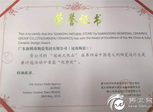 5月28日晚,由陶城报与意大利对外贸易委员会,意大利陶瓷机械及设备制造商协会,倾力打造的第四届中意陶瓷设计大奖赛召开。冠珠陶瓷天然石瓷砖荣获优秀奖。