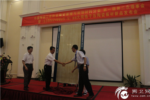 5月28日下午,中国陶瓷工业协会陶瓷幕墙与装饰材料分会一届二次理事会仪在佛山西樵国艺度假酒店召开。会议修订了分会章程,选举通过了机构组织人员,汇报了分会成立以来的各项工作,并在会上推出了由蒙娜丽莎集团最新研发的(1200×2400×5.5)mm大规格干压陶瓷板,同时就陶瓷薄板在幕墙领域的应用进行了深入探讨与研究。中国陶瓷工业协会副理事长傅维杰、广东陶瓷协会会长陈环、陶瓷幕墙与装饰材料理事长萧华和19家副理事长单位、48位理事及诸多新闻媒体共同参加了当天的会议。