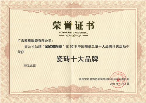金欧雅陶瓷荣获瓷砖十大品牌称号