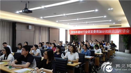 2016年5月26日,由佛山市科学技术局主办、佛山市建材行业协会承办的“佛山建材企业研发费用加计扣除政策宣讲会”在佛山南海举行,来自建材企业的陶瓷砖、水暖卫浴、塑材、不锈钢、墙体瓦面、天花地板、水泥涂料等建材生产企业的技术负责人、项目申报人、财务人员近60人参加了培训。佛山市科学技术局政策法规科科长郭润发、副科长王能文,佛山市建材行业协会秘书长孔海发等领导出席了本次培训班。