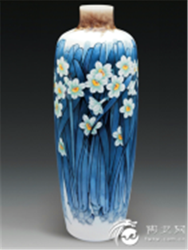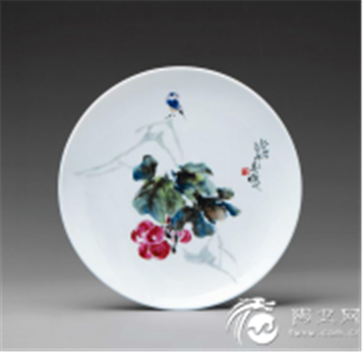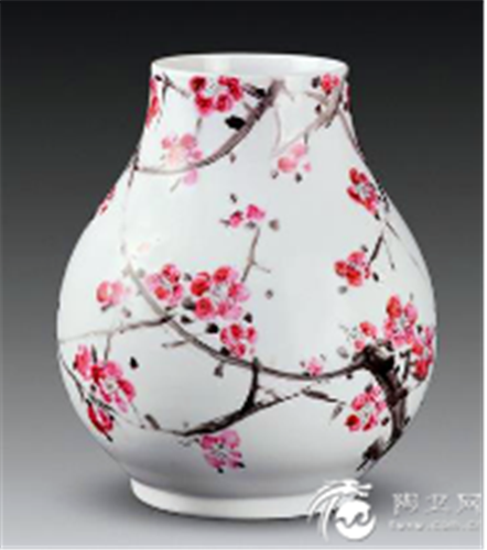 按釉上彩方法施于器物釉面,通过1100~1260℃的高温锻烧,釉面软件包化熔融,使颜料渗入釉内,冷却后釉面封闭。