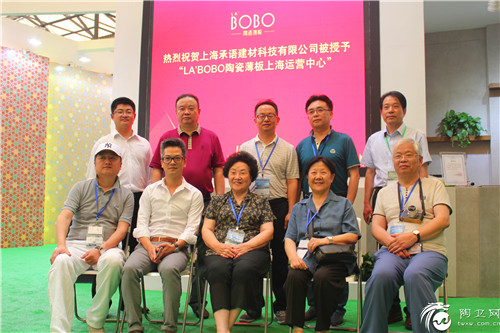 7月5日,2016上海国际绿色环保陶瓷卫浴精品展在上海市浦东新区上海新国际博览中心开幕。当天上午,LA’BOBO陶瓷薄板上海运营中心授牌仪式在W3馆CO3展位隆重举办。上海市人民政府杨浦区整体规划顾问、国家级有成就的室内建筑师、香港国际环境艺术研究院院长郑稼和,上海同济大学沈华英教授,上海建筑标准设计研究院俞美芳高级工程师,LA’BOBO陶瓷薄板董事长唐硕度,LA’BOBO陶瓷薄板中国区营销总经理肖涛,LA’BOBO陶瓷薄板中国区营销总监何永斌,LA’BOBO陶瓷薄板上海运营中心总经理王利刚(上海承语建材有限公司创始人),上海东尼建筑装饰有限公司董事长薛伟国,上海奥邦装饰设计有限公司总经理沈开祥以及苏州金典铭筑装饰工程有限公司董事长张林等嘉宾朋友50多人出席了授牌仪式,一起见证了这一盛事。